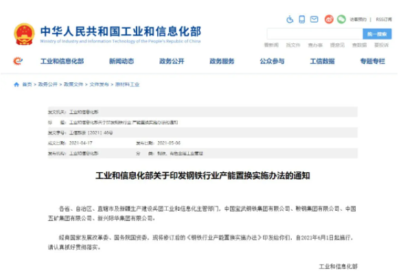 據(jù)工業(yè)和信息化部5月6日消息,為適應(yīng)鋼鐵行業(yè)發(fā)展新形勢(shì),貫徹新發(fā)展理念,構(gòu)建新發(fā)展格局,更好地推動(dòng)高質(zhì)量發(fā)展,按照鋼鐵煤炭行業(yè)化解過(guò)剩產(chǎn)能和脫困發(fā)展工作部際聯(lián)席會(huì)議安排,工信部對(duì)原產(chǎn)能置換實(shí)施辦法進(jìn)行修訂,出臺(tái)了《鋼鐵行業(yè)產(chǎn)能置換實(shí)施辦法》,自2021年6月1日起實(shí)施。大幅提高鋼鐵置換比例,擴(kuò)大大氣污染防治重點(diǎn)區(qū)域,明確置換范圍,嚴(yán)守不新增產(chǎn)能紅線。